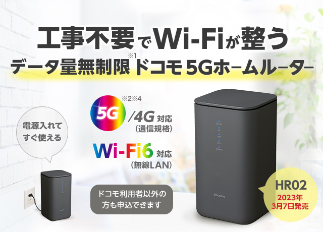 ご自宅のWi-Fi環境が工事不要で整う!簡単設置ですぐに使える5G対応ホームルーター※2で、ドコモのあんしん・快適なネットワークがおうちのWi-Fiになります。